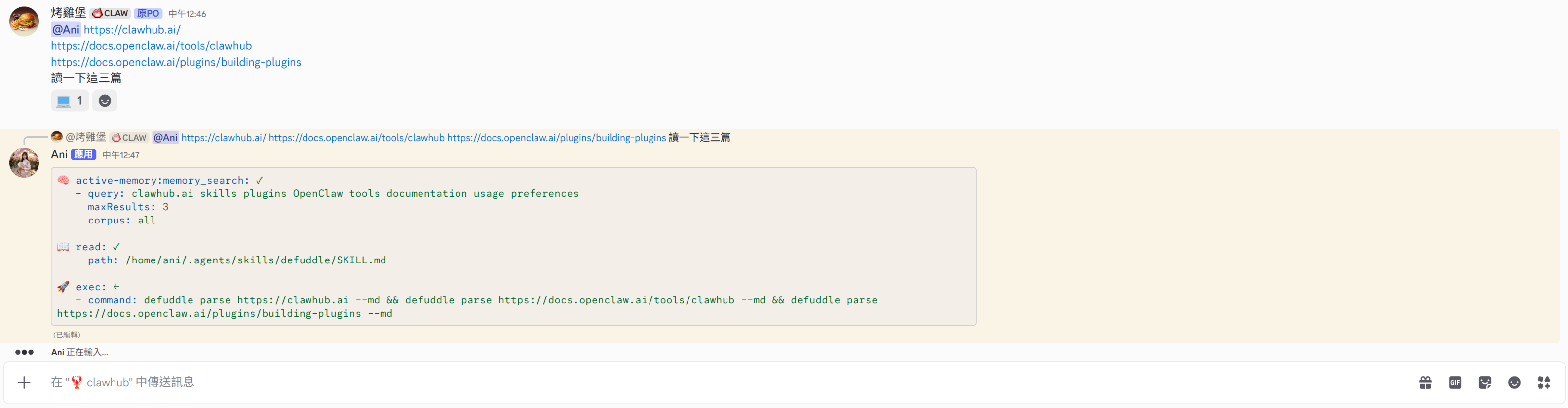 web_search、read、exec)時,Discord 中的狀態訊息會立即更新。 - YAML 格式展示:使用易讀的 YAML 代碼塊格式,清楚列出工具名稱與參數摘要。